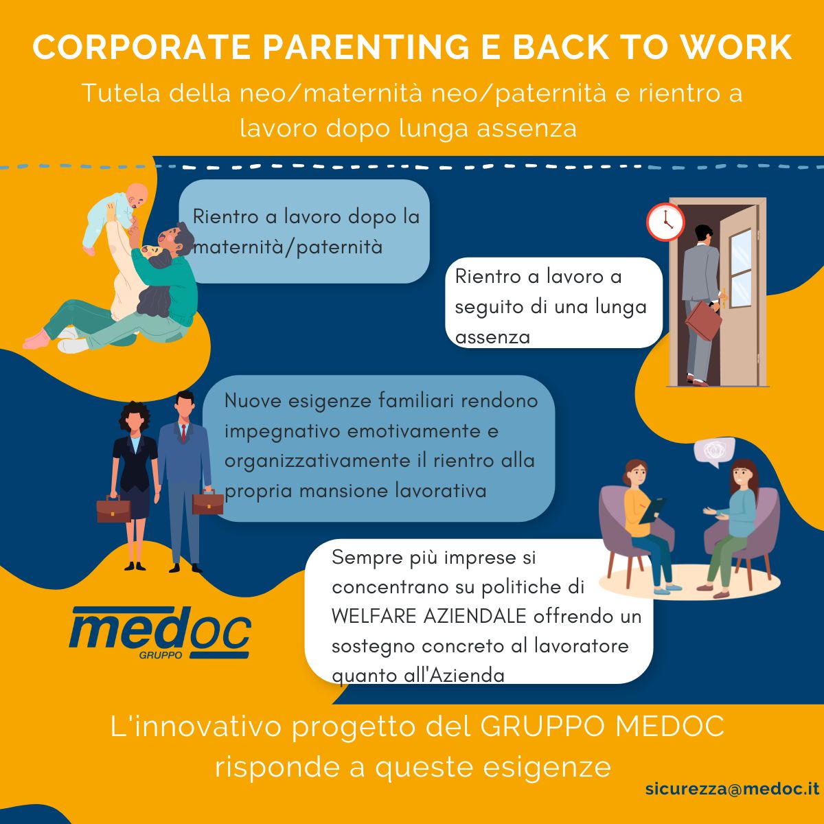 Il Progetto garantisce all’ Azienda e ai suoi lavoratori un supporto alla genitorialità al rientro al lavoro, come aree meritevoli di attenzione nel sistema di WELFARE AZIENDALE, attraverso l’ attivazione di un Auditor MEDOC , ovvero un Counselor allenato all’ ascolto e al focusing.